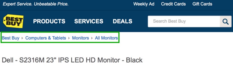 在下面 BestBuy 的页面中,面包屑将产品所在页面的层级关系展现了出来。