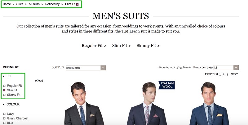 就像 TM Lewin 的这个页面,面包屑展现出的是特定页面对应产品,而产品是按照某个属性来组织的: