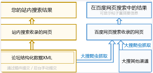 4、上图是百度站内搜索官方给出的影响机制图。您在百度站内搜索中提交的数据(包括通过插件提交或在后台手动提交)除了被站内搜索全部收录外,还会提交给百度网页搜索(即大搜索)进行抓取,也就是在大搜索常规的网页发现渠道之外额外补充来自站内搜索的渠道,从而提升大搜索对您站点的收录情况。