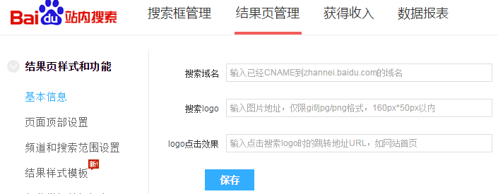 登录站内搜索后台,选择“结果页管理”——>“结果页样式和功能” ——>“基本信息”,如下图:
