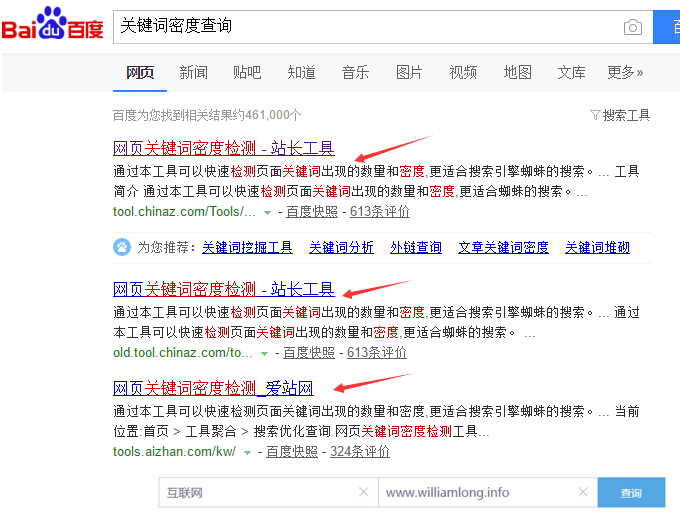查询关键词密度可以通过网络在线工具,用百度搜索“关键词密度查询”。比如,打开“网页关键词密度检测一站长工具”网页,在“关键字”搜索框中输入“互联网”,在“网站地址”搜索框中输入要查询的网址,再单击“查询”按钮,可以看到如图所示的查询结果。关键词“互联网”出现的频率是20次,该页面共有9634个字符,关键词“互联网”出现的字符数是66,占该页面的0.7%,即关键词密度是0.7%。