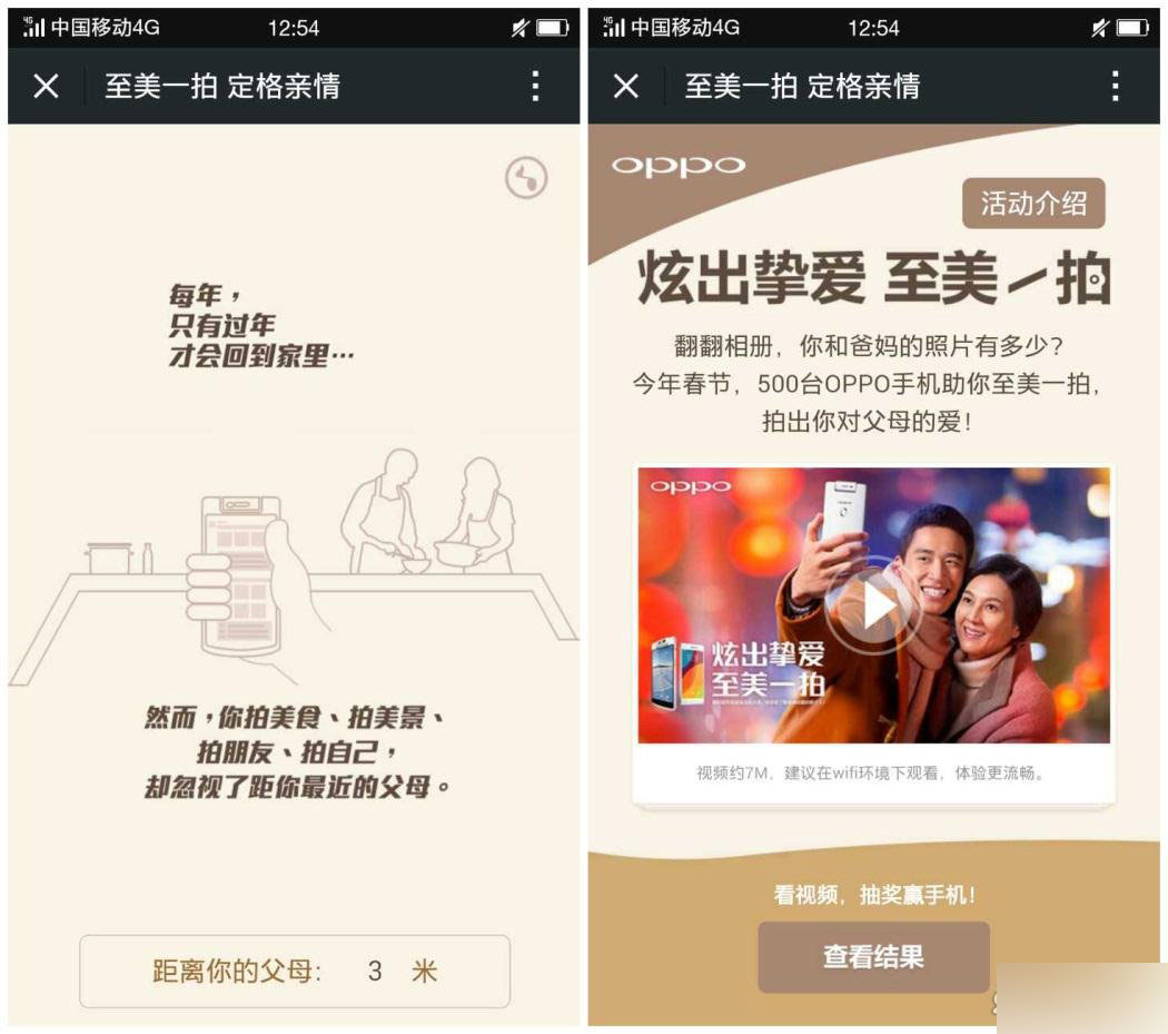 “OPPO的幸福看得见”只是OPPO出现在朋友圈的第一步。广告属性与朋友圈的亲密属性存在的矛盾是摆在OPPO面前的又一难题。“广告易,走心难”是微信广告一石激起千层浪的重要原因,广告出现在亲密属性极强的朋友圈中显得不易被接受。OPPO的脱颖而出正式因为它的反其道而行。OPPO发挥洞悉用户需求的优势,深入挖掘用户情感诉求,找到了年轻人的“软肋“。通过猜谜式的启发引导,呼吁年轻人用手机与父母合影,将停留在表面的煽情口号转化成实际行动,从而完成了一次“深度定制”的情感营销。OPPO手机不再只是冰冷的记录和拍照工具,它成为用户与父母情感沟通的重要桥梁。