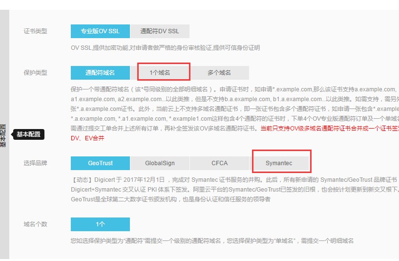 3.“保护类型”选择“一个域名”,品牌选择赛门铁克。