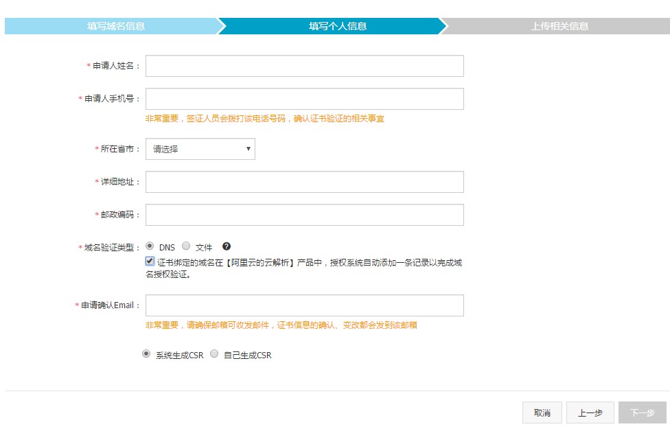 7.填写个人信息,如果域名也在阿里云,域名验证类型可以选择DNS,并勾选。如果域名不在阿里云且服务器是linux的,那么选择文件。