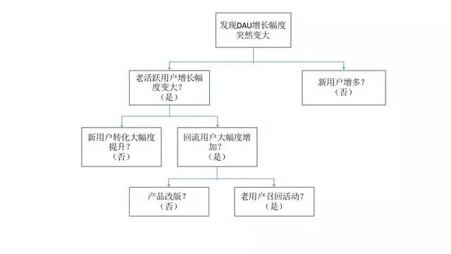 我们继续以产品运营为例,比如我们突然发现某天产品的DAU增长幅度变大,按照上述的分析思路我们进行相应的梳理: