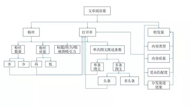 比如我们以公众号运营为例,公众号运营的关键指标是粉丝数和文章阅读量,而粉丝数和文章阅读量的影响纬度肯有很多个。这些纬度之间也存在相应的影响关系,具体如下: