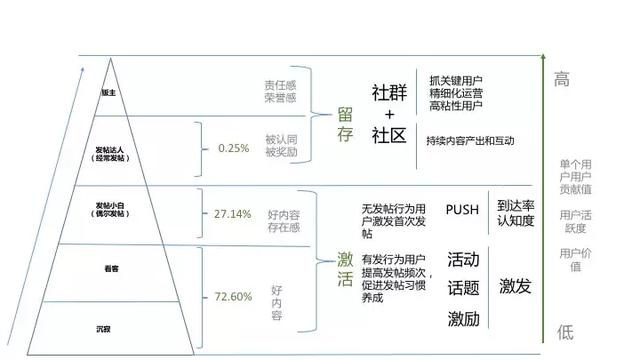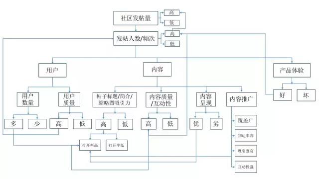 社区发帖量这一核心数据指标提升,是与整个社区的用户量,用户层级比例,用户层级转化,每个层级用户行为,用户粘性,社区内容质量,内容展示与推送情况等都存在一定的相关关系。所以,在社区的运营过程中就要不断的促进各个影响维度与社区发帖量的正向关系。
