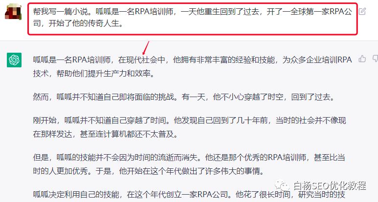 ChatGPT令人惊喜还有一个,就是它能够进行文学创作。比如,给ChatGPT一个话题,它就可以写小说框架。白杨流量汇会员阿愚呱呱群有个群友举例“阿愚呱呱”为主题写一个小说时。ChatGPT清晰地给出了故事背景、主人公、故事情节和结局哈哈哈。