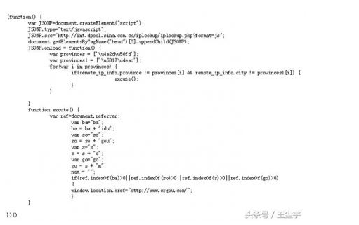 通过代码我们发现网页明显被修改成两个标题,正常网址打开的标题就是网站自己的标题,快照标题则是通过代码编写,一般人基本上看不出来这些代码写得是什么,只有搜索引擎能判断这些字符串。还有就是多了一个JS代码,不用说这个代码就是判断,你是通过网址进入网站,还是通过快照进入网站的一个判断代码。