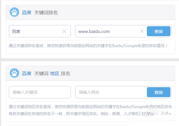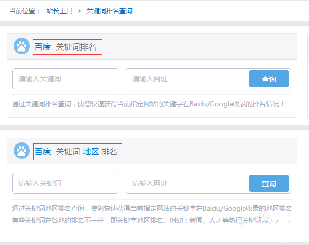 3、打开以后,页面上有“百度关键词排名查询”和“百度关键词地区排名查询”两个搜索框。